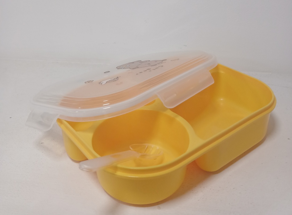 Lonchera plástica de 4 divisiones y una cuchara-tenedor 26 cm * 23 cm y 6 cm de alto El color puede variar