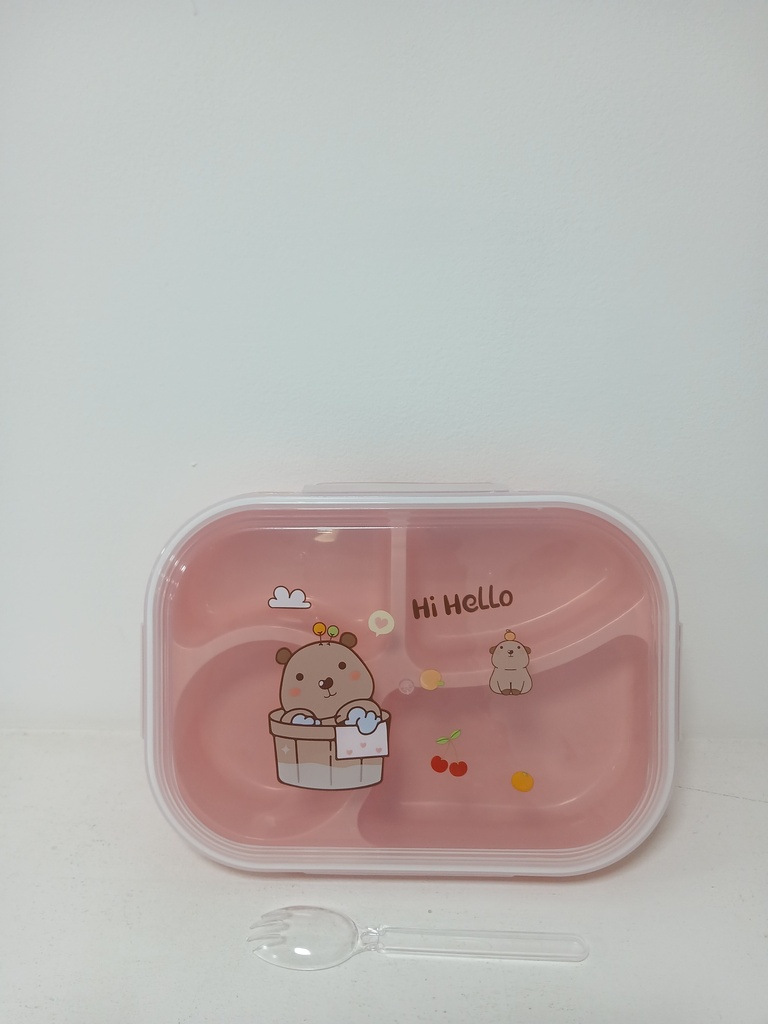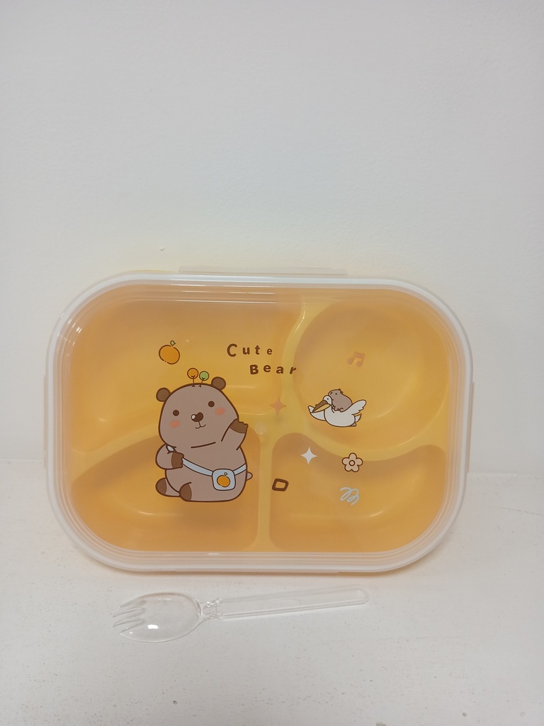 Lonchera plástica de 4 divisiones y una cuchara-tenedor 26 cm * 23 cm y 6 cm de alto El color puede variar